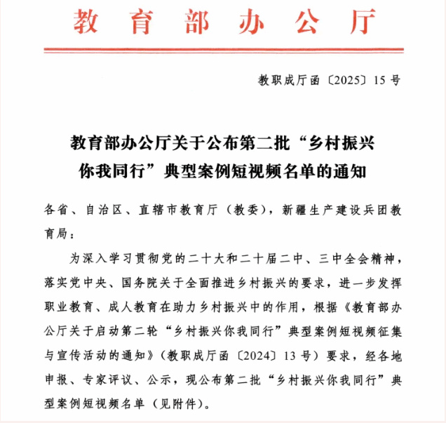 为进一步发挥职业教育、成人教育在助力乡村振兴中的作用,经各地申报、专家评议、公示,教育部从全国遴选出74个作品,湖北仅4个,入选第二批“乡村振兴 你我同行”典型案例短视频名单。