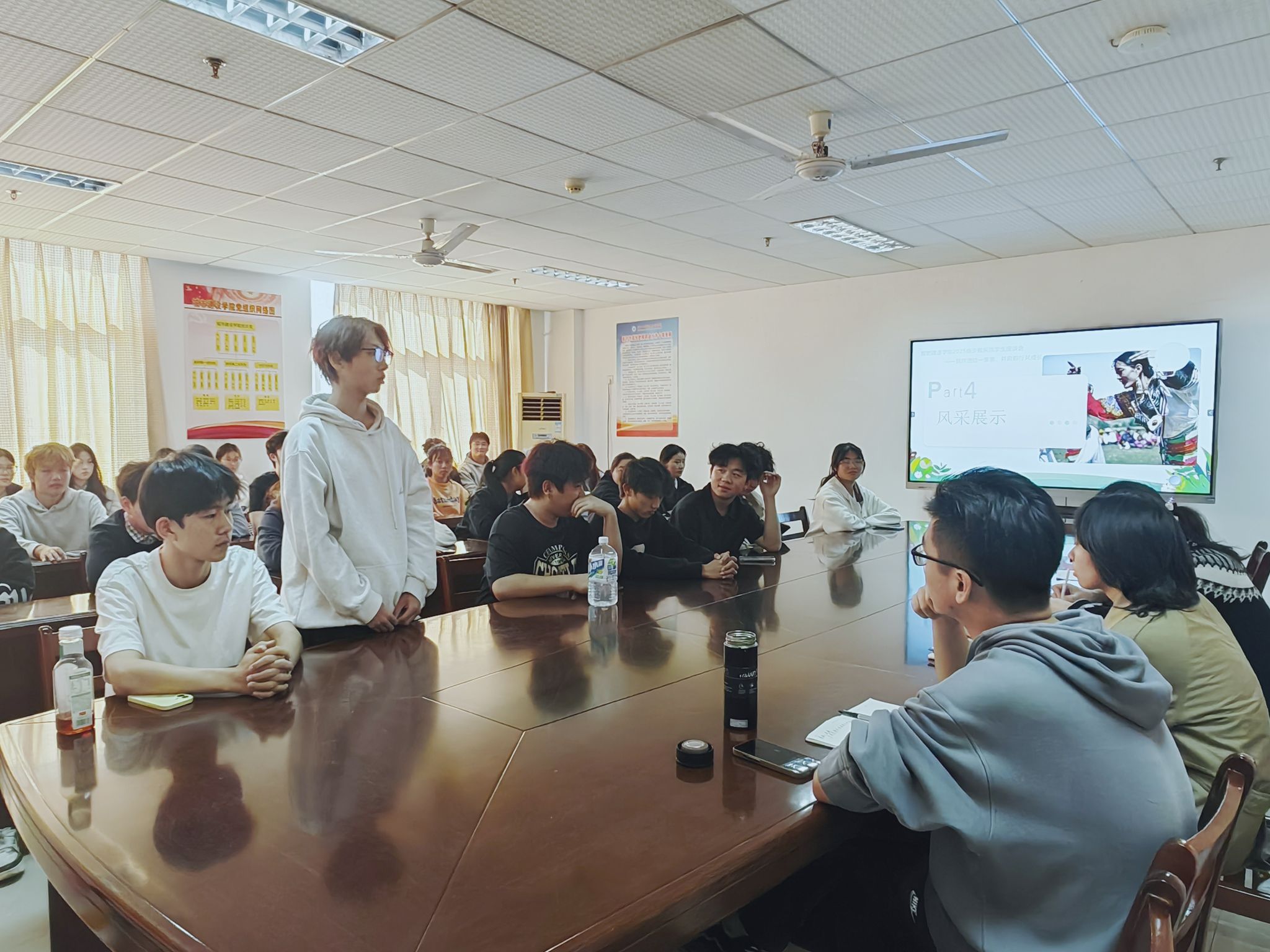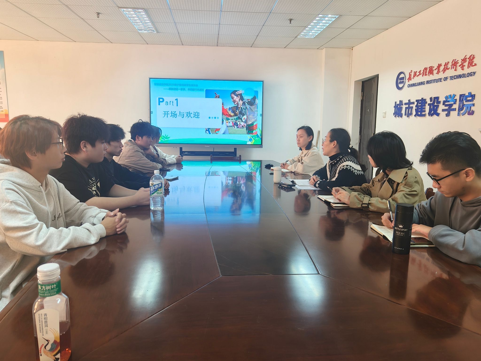 开场环节,吴静介绍会议背景,阐明座谈会旨在搭建沟通桥梁;李俊致欢迎辞,向新生传递公司关怀,为活动拉开序幕。随后,全体师生共同观看民族团结教育宣传片,强化新生对民族团结的认知。