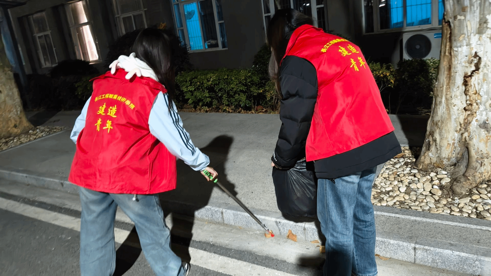 夜色之中,志愿者们手持清洁工具,活跃于校园主干道、教学楼周边等区域。他们分工有序,相互协作,不仅仔细清理路面落叶,也将散落的垃圾一一拾起,集中归置到指定区域。忙碌的身影映照着路灯,成为校园里一道温暖而明亮的风景,也在躬身劳动中生动诠释着“奉献、友爱、互助、进步”的志愿精神。